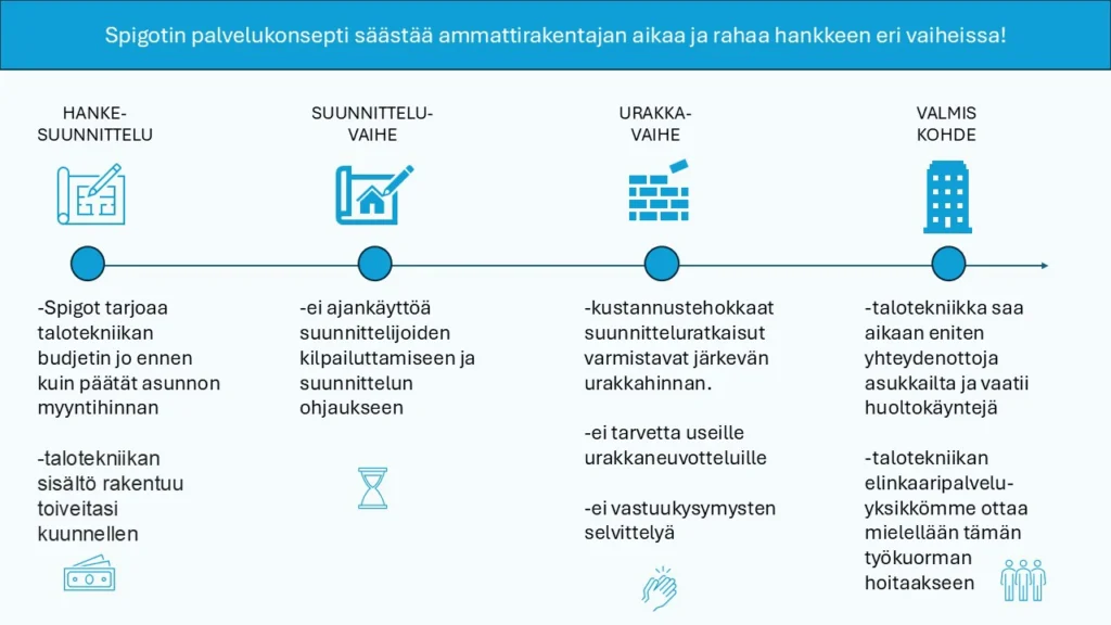 Spigotin mallissa rakentaja saa tekniikan läpikotaisin tuntevan kumppanin tueksi mukaan heti alussa tekemään oikeita valintoja ja vaikkapa kommentoimaan tekniikan tilavarauksia. Näin vältytään yllätyksiltä ja kaikki tekniikan kustannukset ovat tiedossa jo hankesuunnitteluvaiheessa, ennen kuin asunnon myyntihinta päätetään.